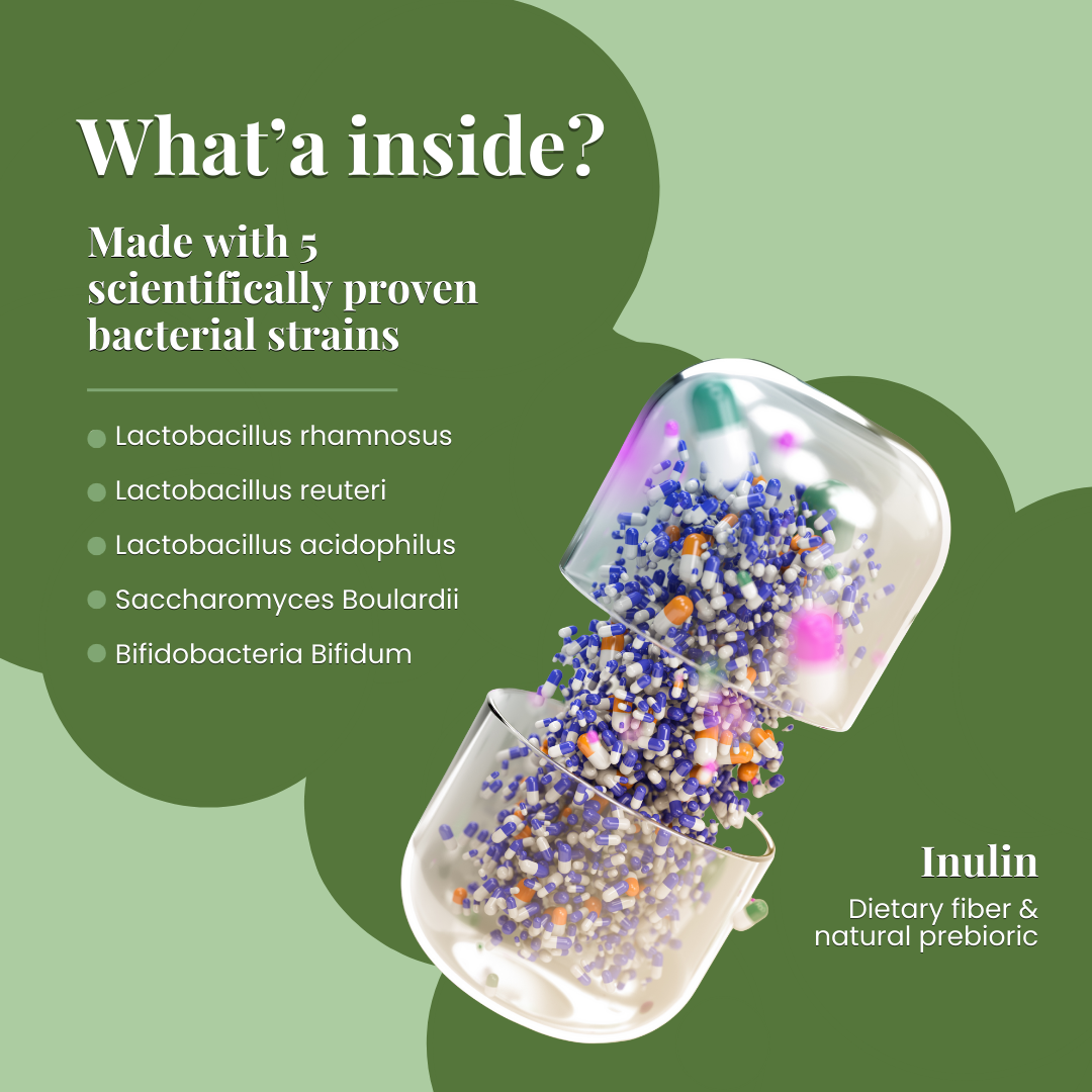Live Bacteria (from Saccharomyces boulardii, Lactobacillus rhamnosus, Lactobacillus acidophilus, Lactobacillus reuteri, Bifidobacterium bifidum) – 10 billion CFU