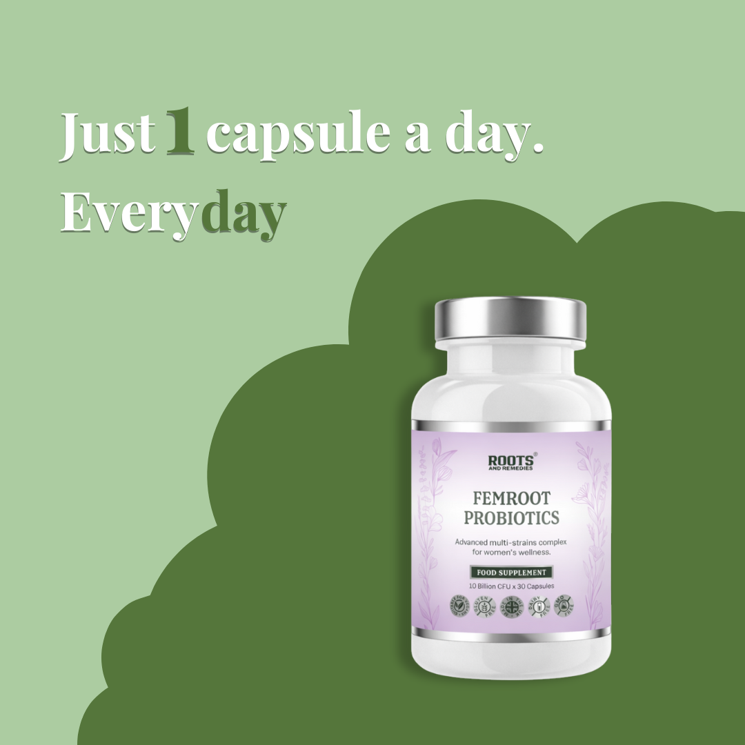 Roots & Remedies Femroot Probiotics is a food supplement formulated with a blend of live cultures and chicory inulin (FOS). It contains five live strains including Saccharomyces boulardii, Lactobacillus rhamnosus, Lactobacillus acidophilus, Lactobacillus reuteri, and Bifidobacterium bifidum.